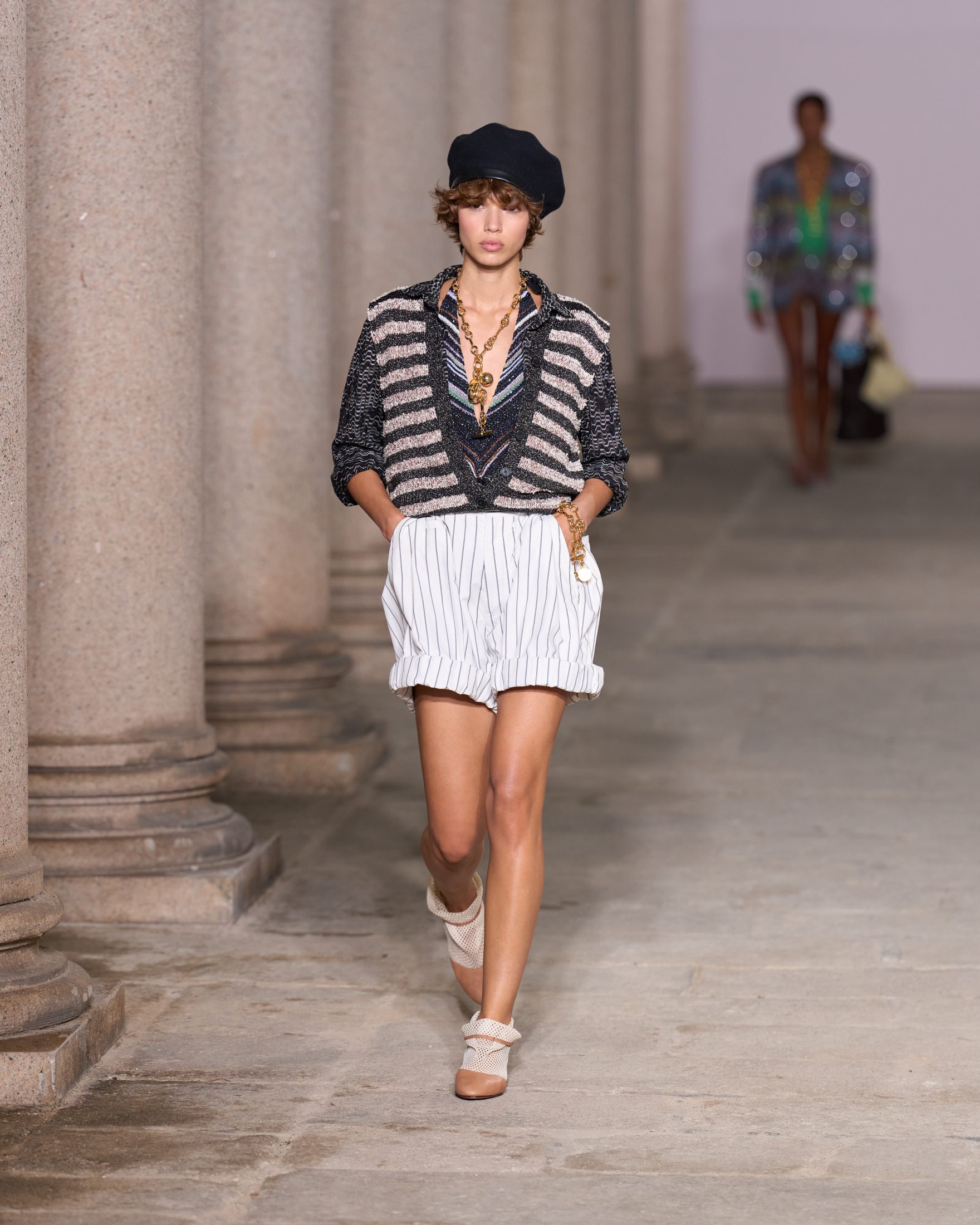 Bermuda, gonne e short costissimi accosstate a morbide giacche in cotone o a cardigan fantasia e ancora blazer gessati, baschi e maxi bag sfilano alla Milano Fashion Week sulla passerella Primavera/Estate 2026 di Missoni