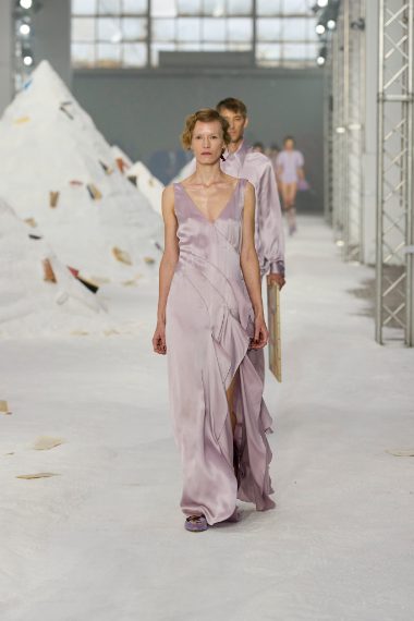 Soavi abiti in seta lilla e sontuosi modelli principeschi in tulle, fantasie floreali, stampe rigate e capi in denim patchwork sfilano alla Milano Fashion Week sulla passerella Primavera/Estate 2026 di Antonio Marras