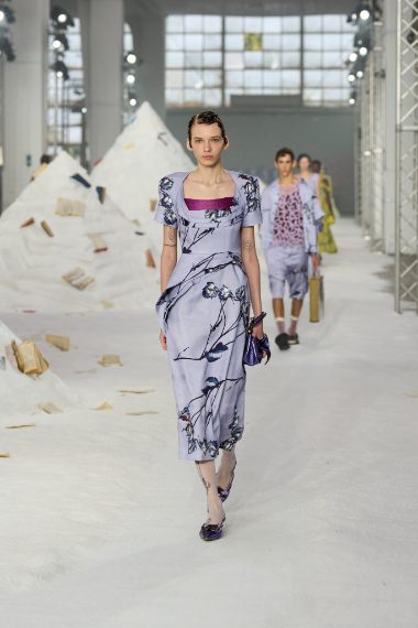 Soavi abiti in seta lilla e sontuosi modelli principeschi in tulle, fantasie floreali, stampe rigate e capi in denim patchwork sfilano alla Milano Fashion Week sulla passerella Primavera/Estate 2026 di Antonio Marras