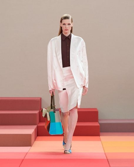 Linee rigorose e accostamenti color block si mescolano con pizzo floreale, intrecci knitting e con dettagli rubati allo sportswear sulla passerella Primavera/Estate 2026 di Fendi nella collezione presentata alla Milano Fashion Week.