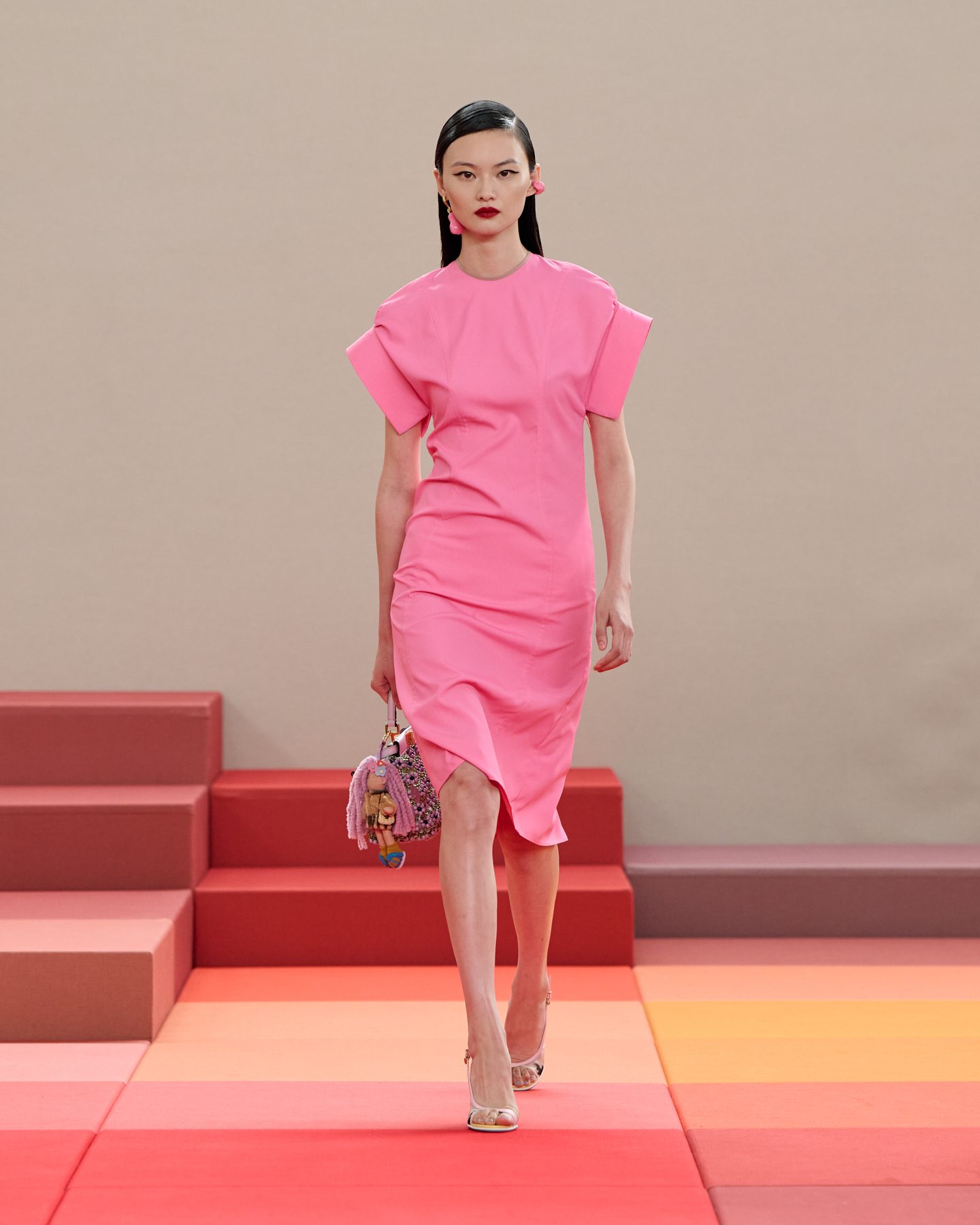 Linee rigorose e accostamenti color block si mescolano con pizzo floreale, intrecci knitting e con dettagli rubati allo sportswear sulla passerella Primavera/Estate 2026 di Fendi nella collezione presentata alla Milano Fashion Week.
