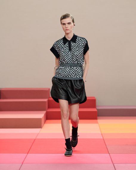 Linee rigorose e accostamenti color block si mescolano con pizzo floreale, intrecci knitting e con dettagli rubati allo sportswear sulla passerella Primavera/Estate 2026 di Fendi nella collezione presentata alla Milano Fashion Week.