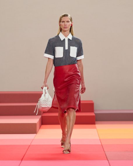 Linee rigorose e accostamenti color block si mescolano con pizzo floreale, intrecci knitting e con dettagli rubati allo sportswear sulla passerella Primavera/Estate 2026 di Fendi nella collezione presentata alla Milano Fashion Week.