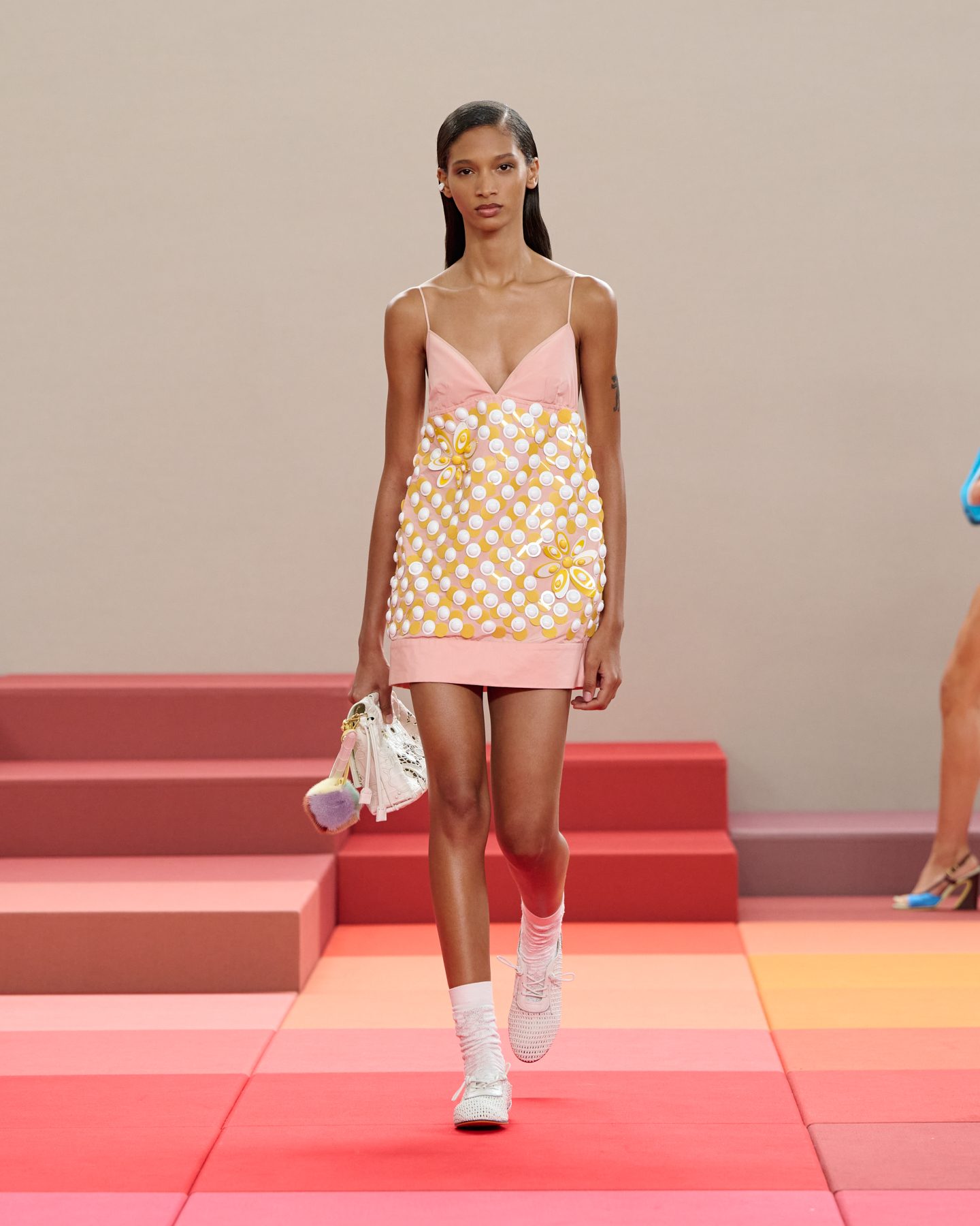 Linee rigorose e accostamenti color block si mescolano con pizzo floreale, intrecci knitting e con dettagli rubati allo sportswear sulla passerella Primavera/Estate 2026 di Fendi nella collezione presentata alla Milano Fashion Week.