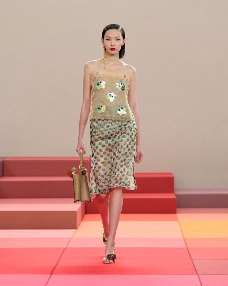 Linee rigorose e accostamenti color block si mescolano con pizzo floreale, intrecci knitting e con dettagli rubati allo sportswear sulla passerella Primavera/Estate 2026 di Fendi nella collezione presentata alla Milano Fashion Week.