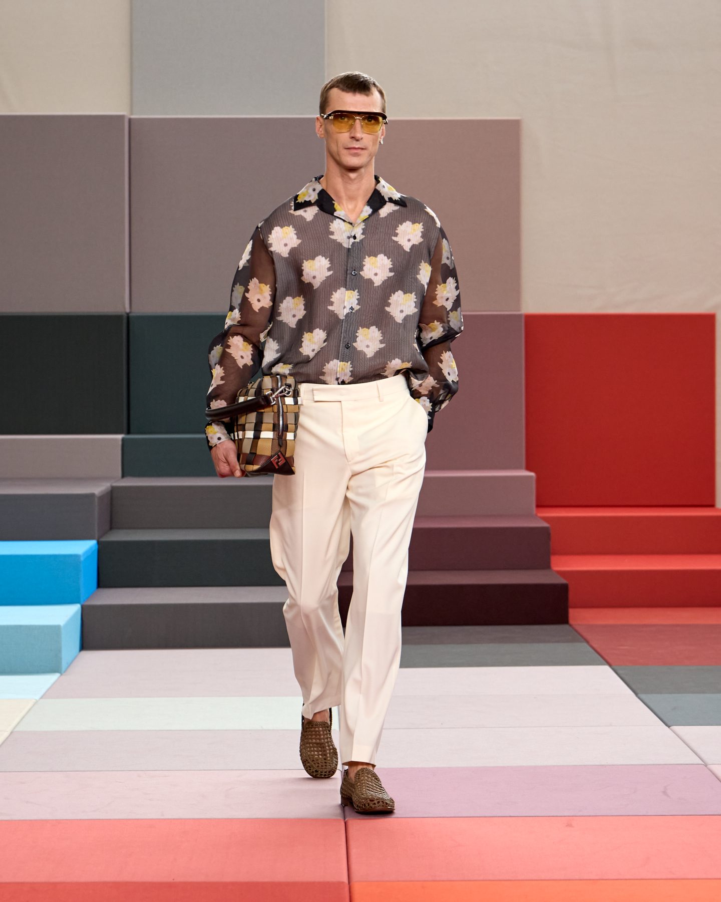 Linee rigorose e accostamenti color block si mescolano con pizzo floreale, intrecci knitting e con dettagli rubati allo sportswear sulla passerella Primavera/Estate 2026 di Fendi nella collezione presentata alla Milano Fashion Week.