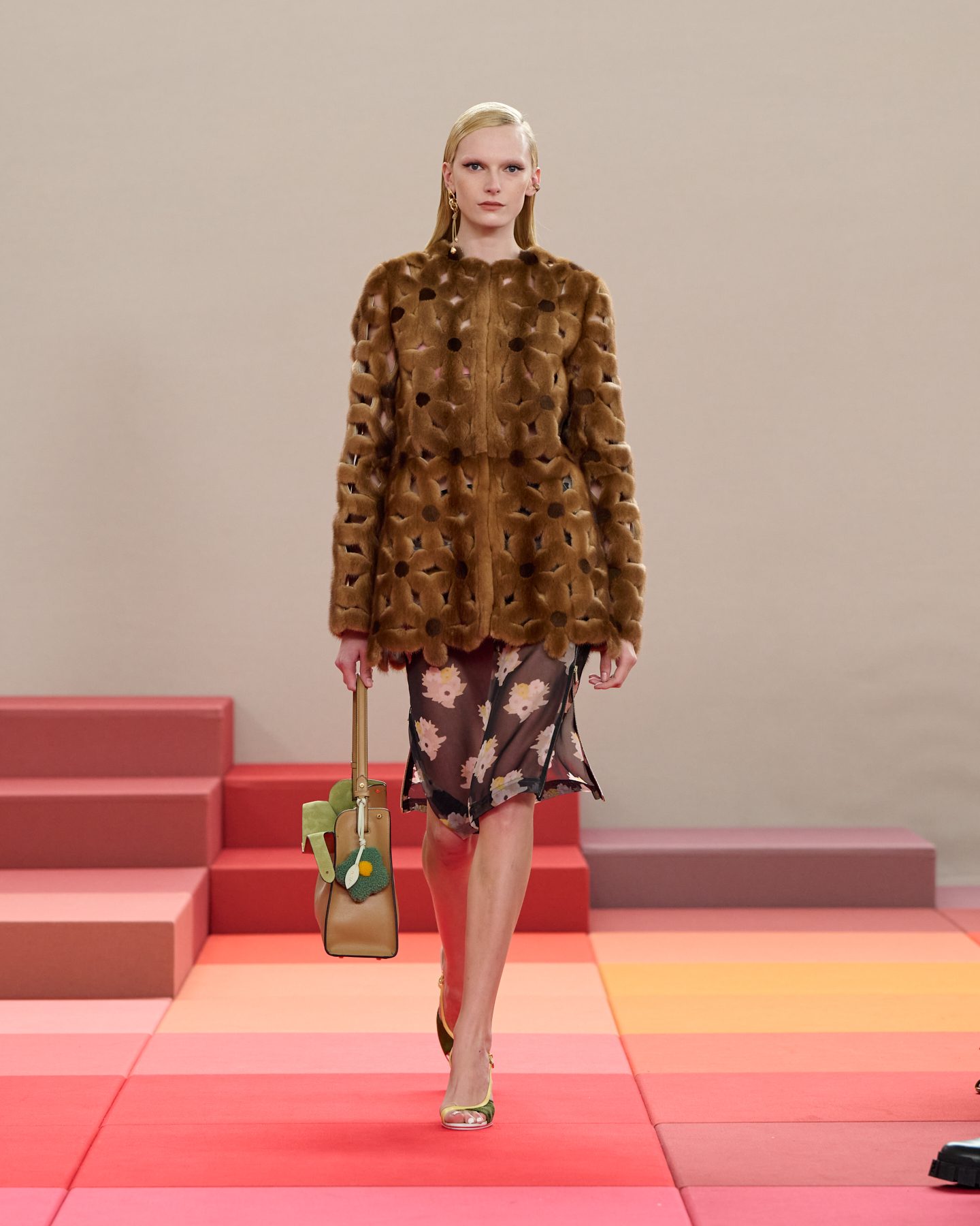 Linee rigorose e accostamenti color block si mescolano con pizzo floreale, intrecci knitting e con dettagli rubati allo sportswear sulla passerella Primavera/Estate 2026 di Fendi nella collezione presentata alla Milano Fashion Week.