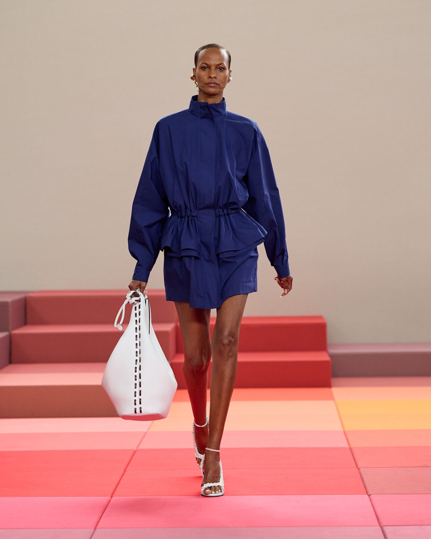 Linee rigorose e accostamenti color block si mescolano con pizzo floreale, intrecci knitting e con dettagli rubati allo sportswear sulla passerella Primavera/Estate 2026 di Fendi nella collezione presentata alla Milano Fashion Week.