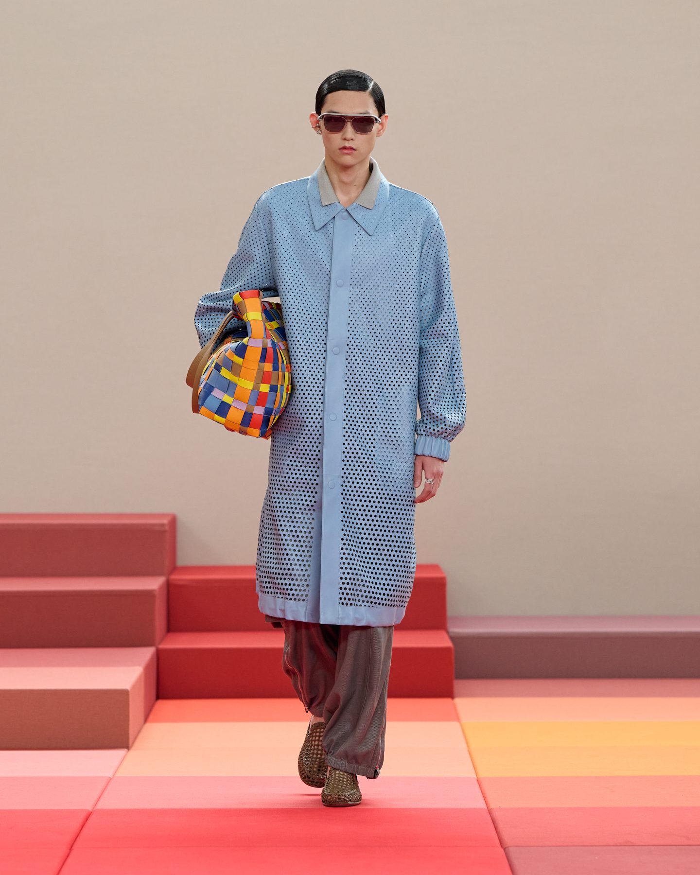 Linee rigorose e accostamenti color block si mescolano con pizzo floreale, intrecci knitting e con dettagli rubati allo sportswear sulla passerella Primavera/Estate 2026 di Fendi nella collezione presentata alla Milano Fashion Week.