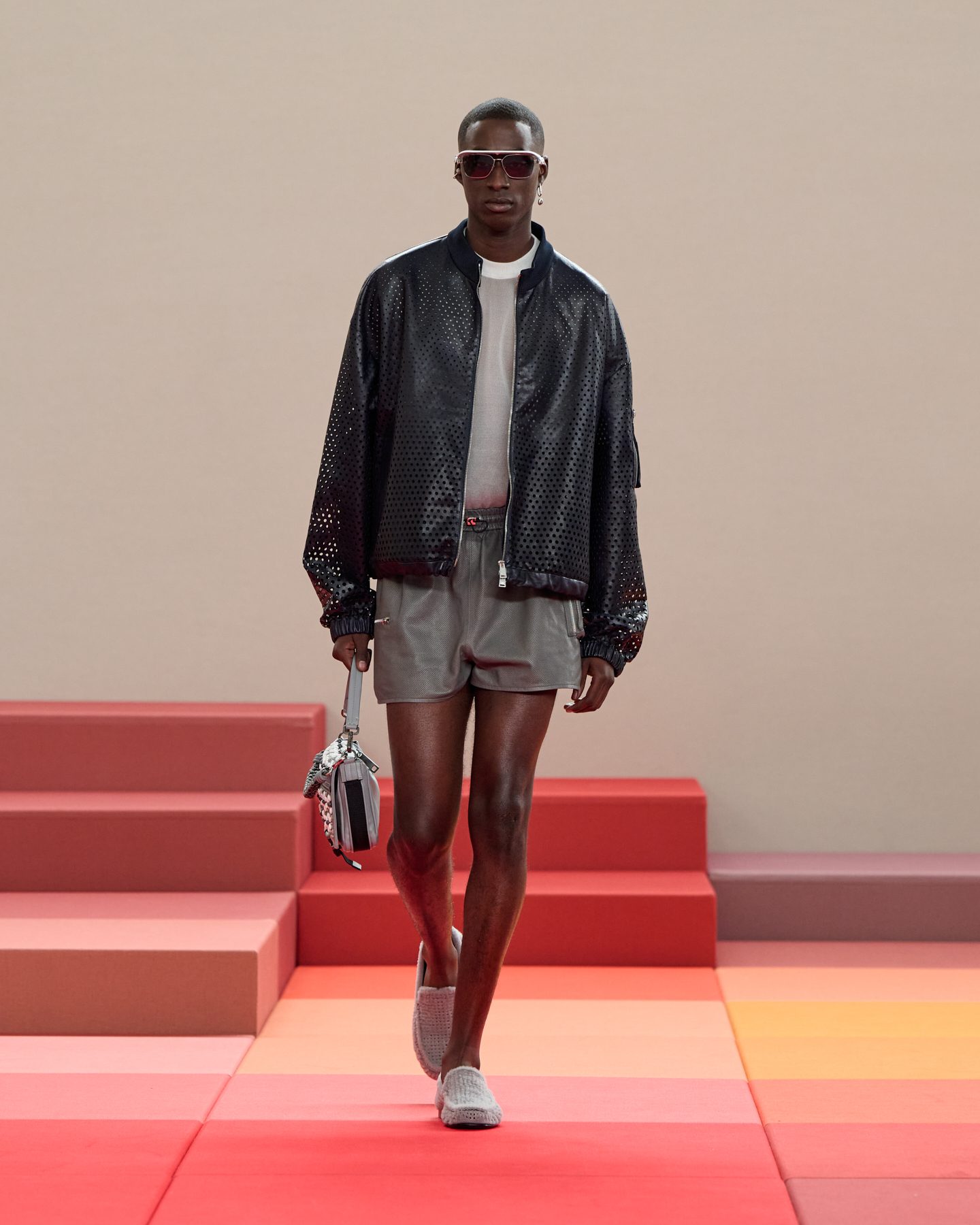 Linee rigorose e accostamenti color block si mescolano con pizzo floreale, intrecci knitting e con dettagli rubati allo sportswear sulla passerella Primavera/Estate 2026 di Fendi nella collezione presentata alla Milano Fashion Week.