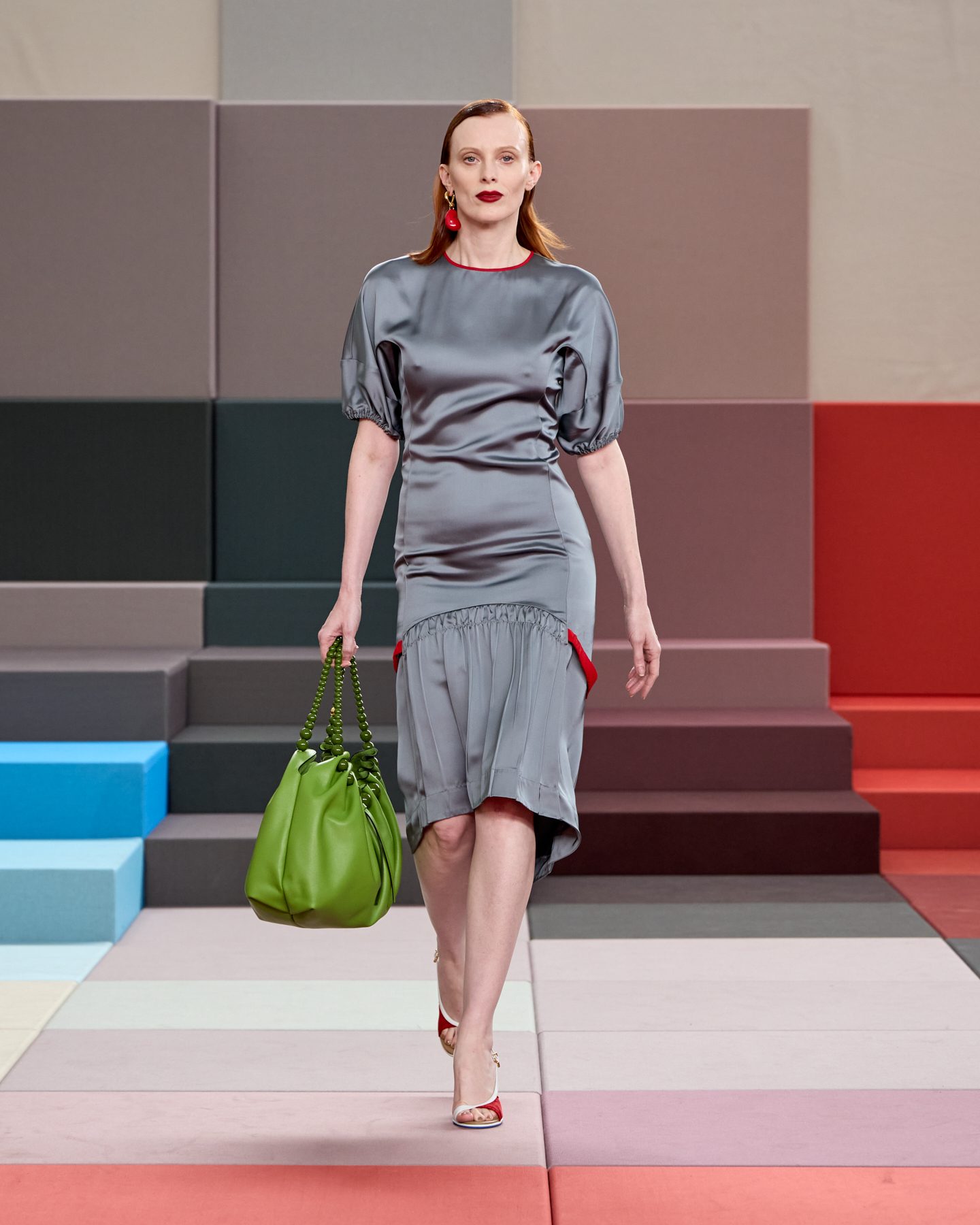 Linee rigorose e accostamenti color block si mescolano con pizzo floreale, intrecci knitting e con dettagli rubati allo sportswear sulla passerella Primavera/Estate 2026 di Fendi nella collezione presentata alla Milano Fashion Week.