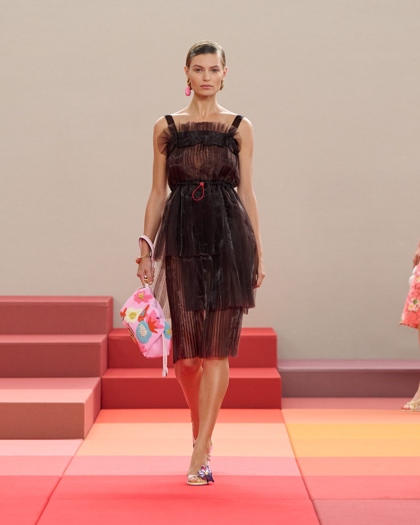 Linee rigorose e accostamenti color block si mescolano con pizzo floreale, intrecci knitting e con dettagli rubati allo sportswear sulla passerella Primavera/Estate 2026 di Fendi nella collezione presentata alla Milano Fashion Week.