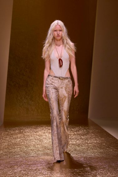 Abiti plissé, stampe pitone, intrecci e una cascata d'oro sfilano alla Milano Fashion Week sulla passerella Primavera/Estate 2026 di Roberto Cavalli nella collezione disegnata da Fausto Puglisi e ispirata a Cleopatra