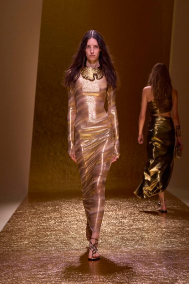 Abiti plissé, stampe pitone, intrecci e una cascata d'oro sfilano alla Milano Fashion Week sulla passerella Primavera/Estate 2026 di Roberto Cavalli nella collezione disegnata da Fausto Puglisi e ispirata a Cleopatra