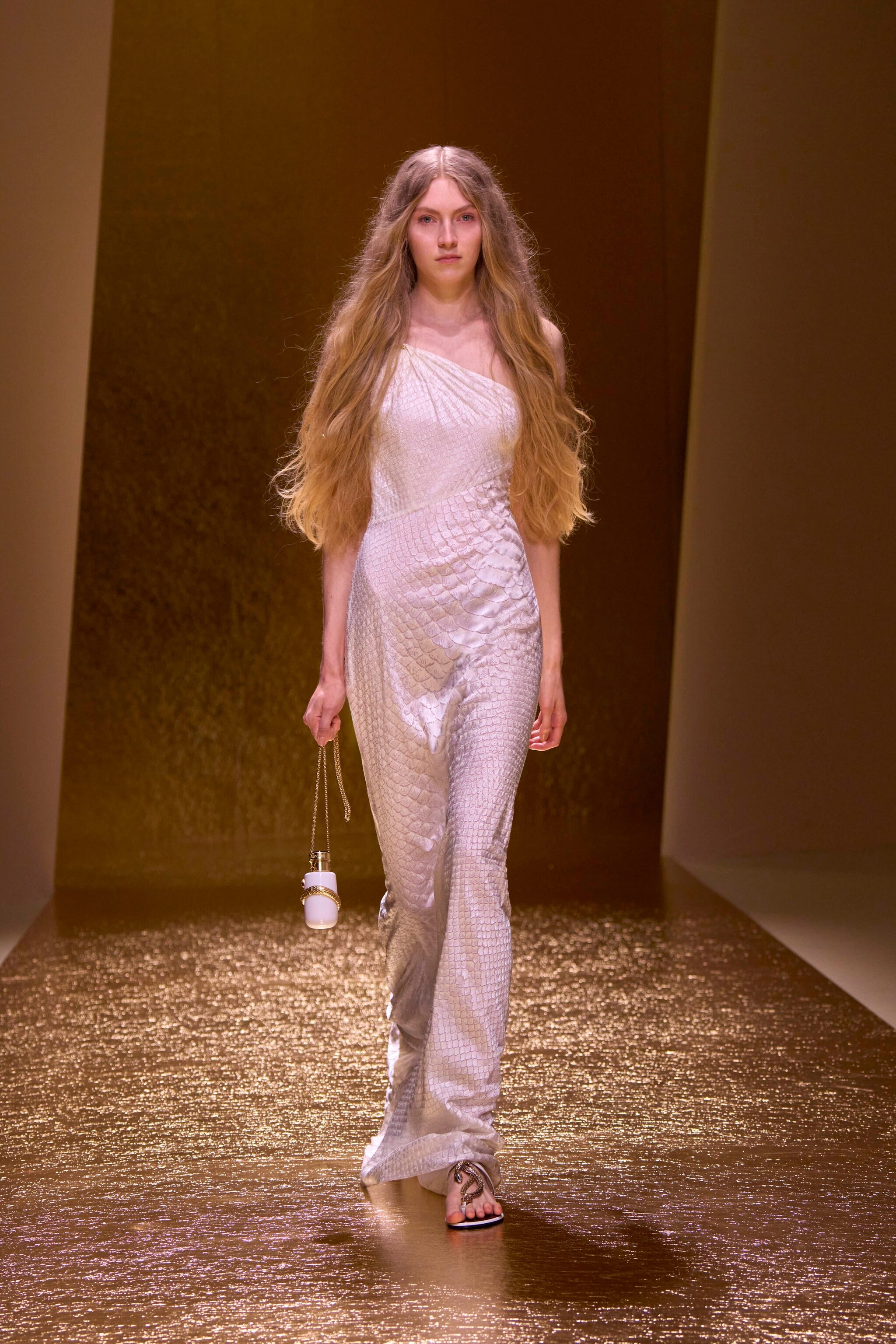 Abiti plissé, stampe pitone, intrecci e una cascata d'oro sfilano alla Milano Fashion Week sulla passerella Primavera/Estate 2026 di Roberto Cavalli nella collezione disegnata da Fausto Puglisi e ispirata a Cleopatra