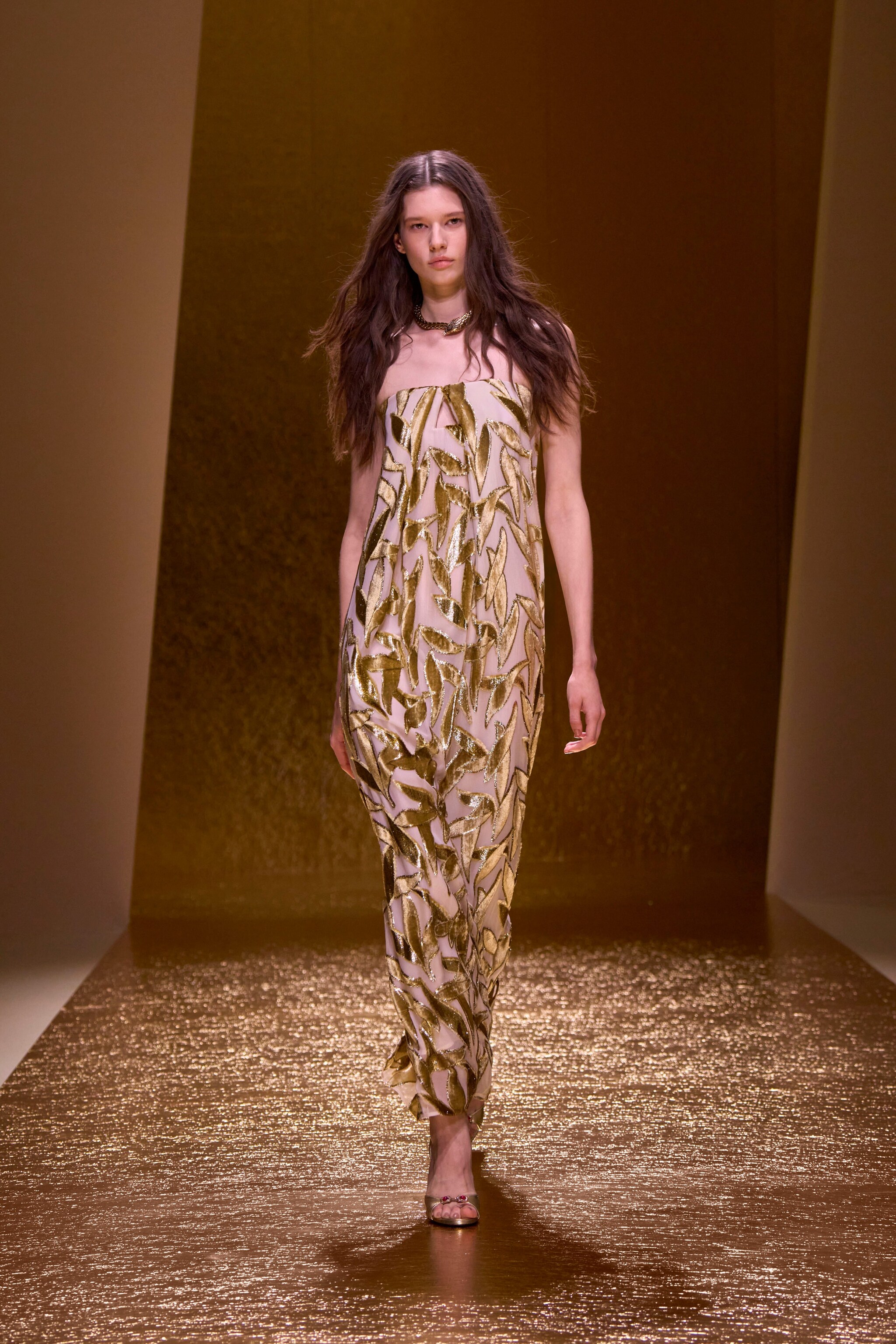 Abiti plissé, stampe pitone, intrecci e una cascata d'oro sfilano alla Milano Fashion Week sulla passerella Primavera/Estate 2026 di Roberto Cavalli nella collezione disegnata da Fausto Puglisi e ispirata a Cleopatra