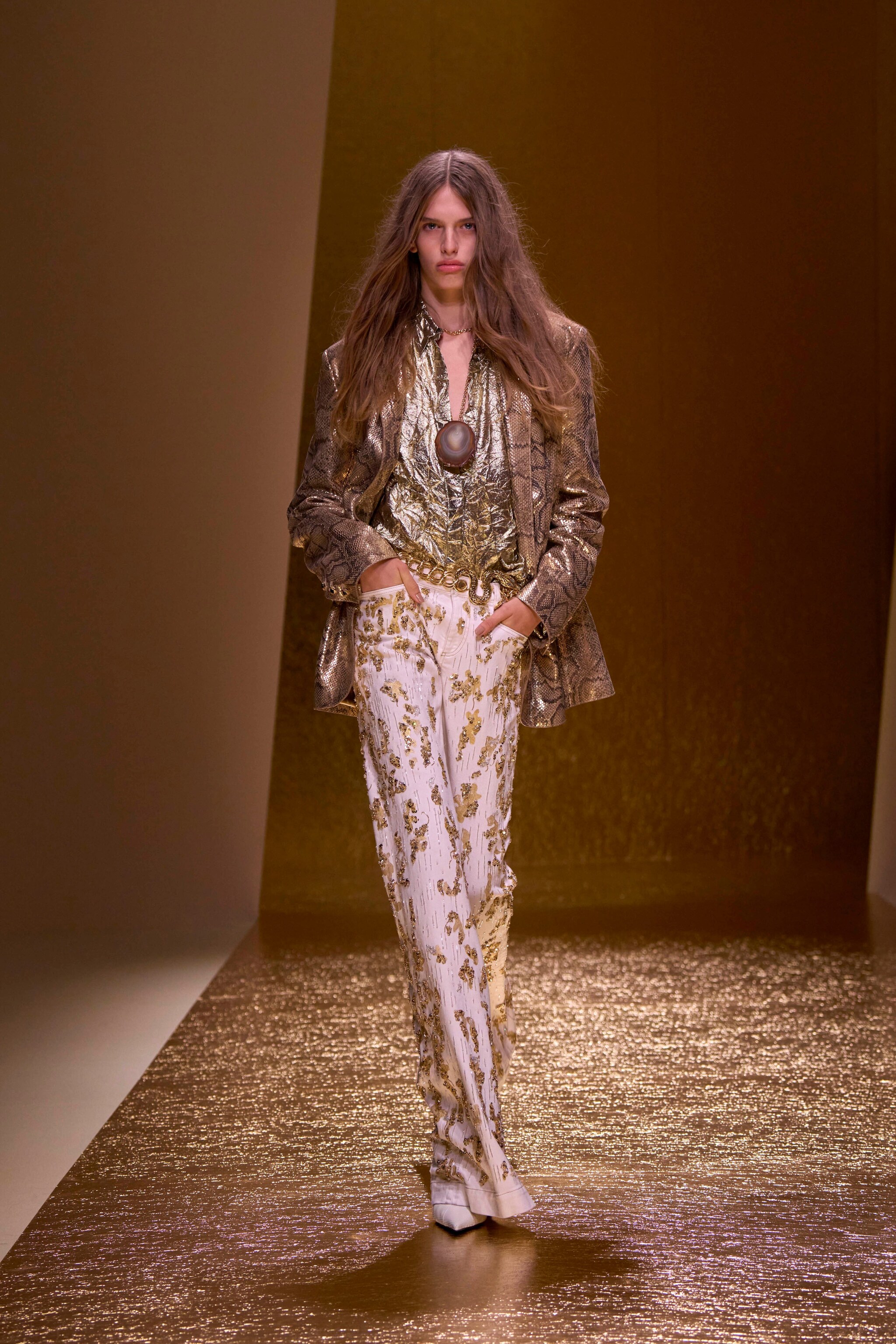 Abiti plissé, stampe pitone, intrecci e una cascata d'oro sfilano alla Milano Fashion Week sulla passerella Primavera/Estate 2026 di Roberto Cavalli nella collezione disegnata da Fausto Puglisi e ispirata a Cleopatra