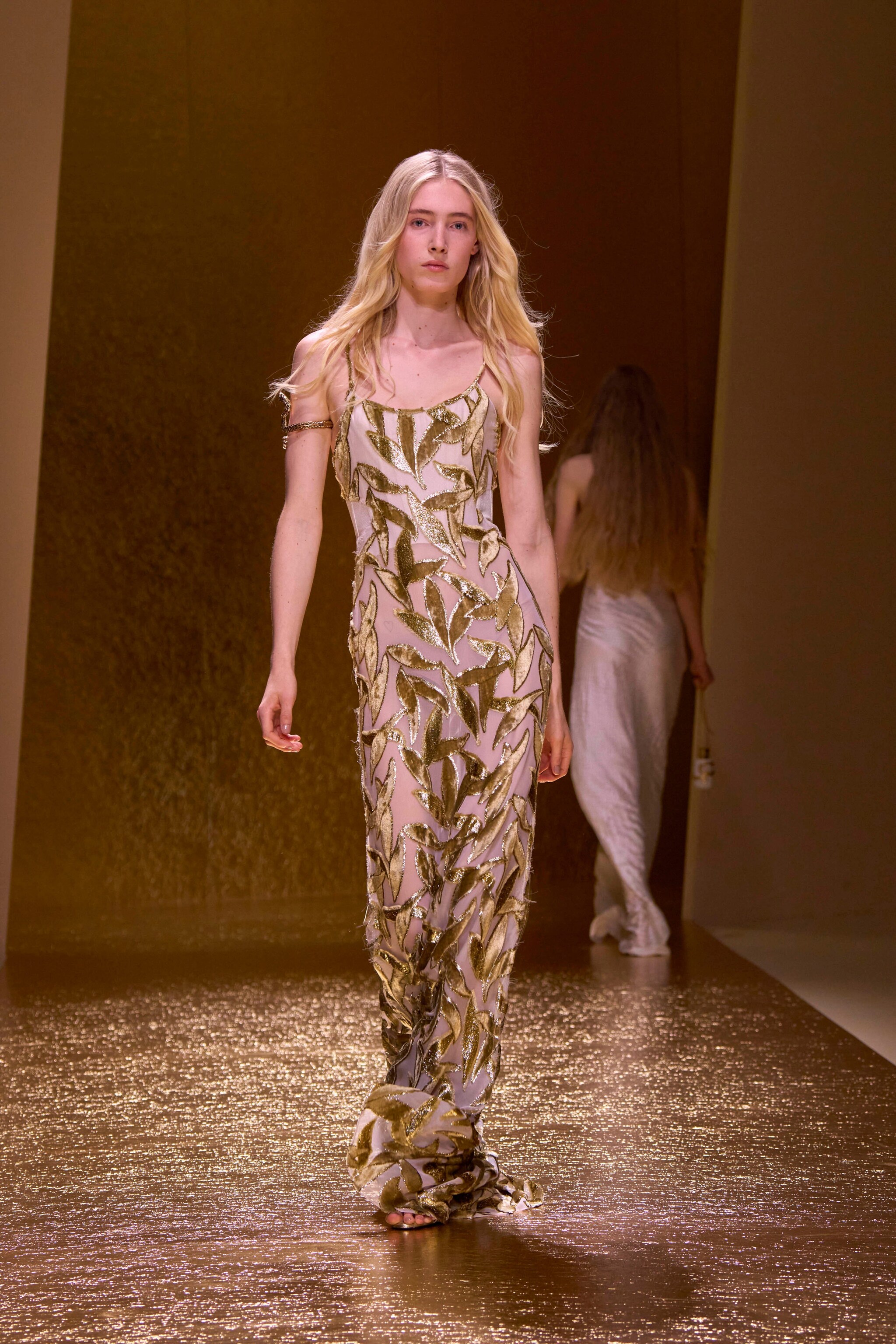 Abiti plissé, stampe pitone, intrecci e una cascata d'oro sfilano alla Milano Fashion Week sulla passerella Primavera/Estate 2026 di Roberto Cavalli nella collezione disegnata da Fausto Puglisi e ispirata a Cleopatra