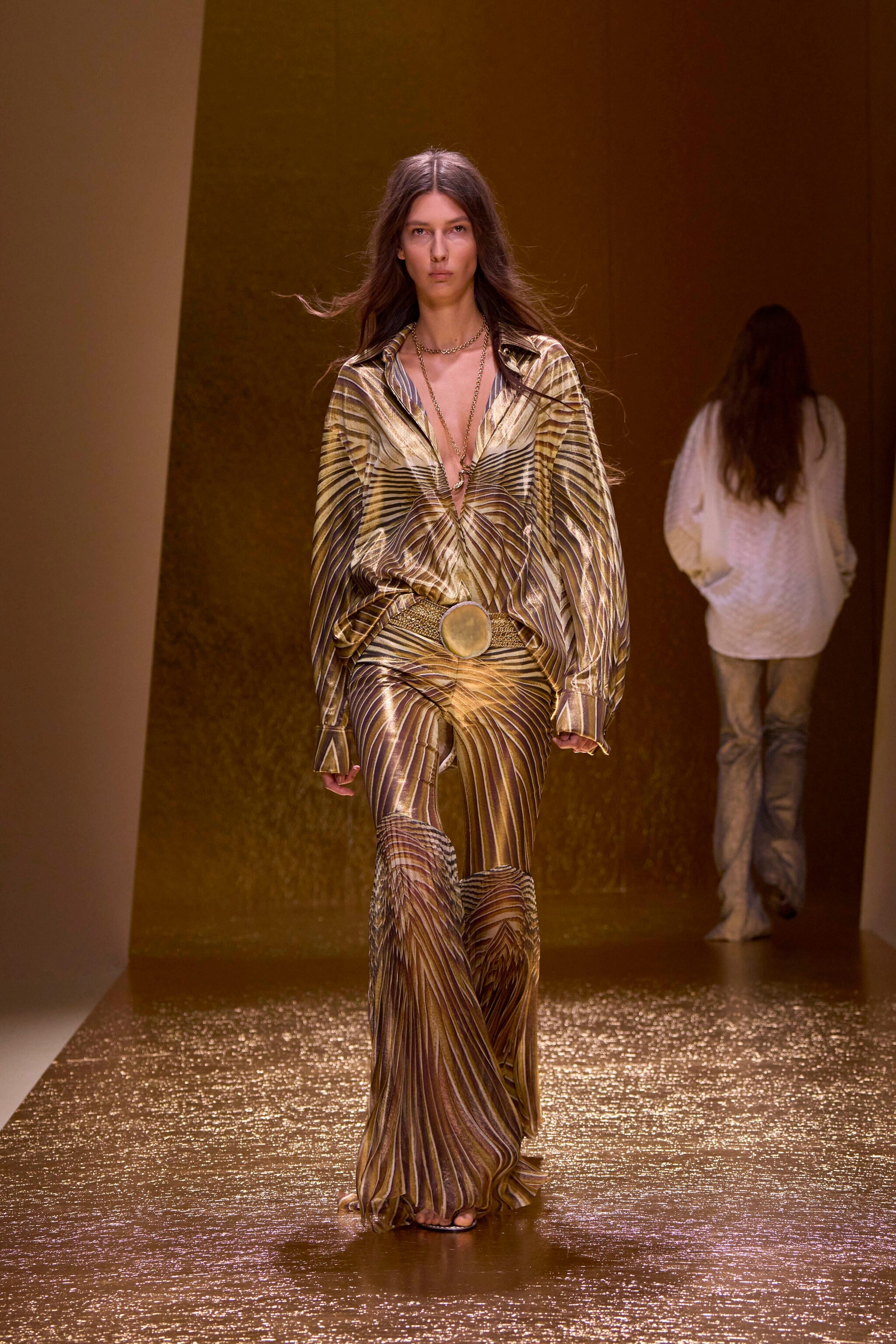 Abiti plissé, stampe pitone, intrecci e una cascata d'oro sfilano alla Milano Fashion Week sulla passerella Primavera/Estate 2026 di Roberto Cavalli nella collezione disegnata da Fausto Puglisi e ispirata a Cleopatra