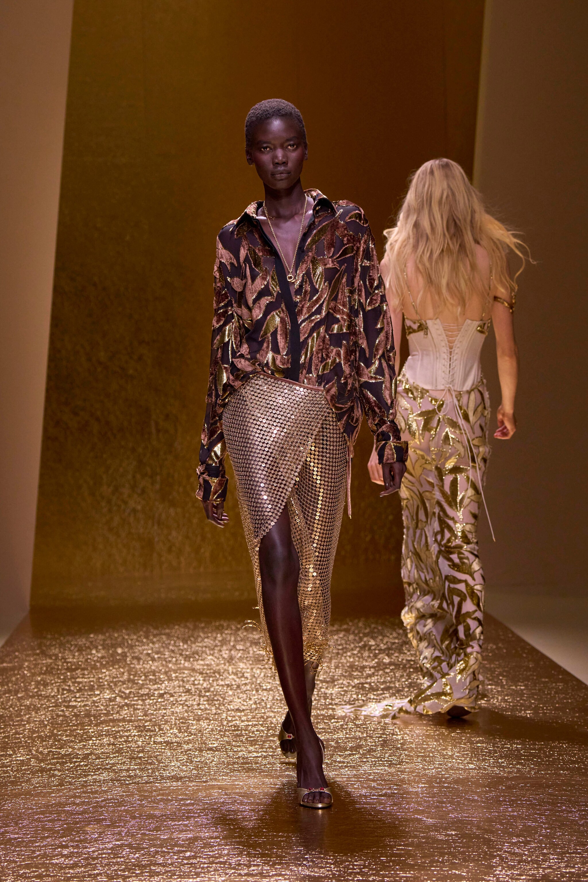Abiti plissé, stampe pitone, intrecci e una cascata d'oro sfilano alla Milano Fashion Week sulla passerella Primavera/Estate 2026 di Roberto Cavalli nella collezione disegnata da Fausto Puglisi e ispirata a Cleopatra