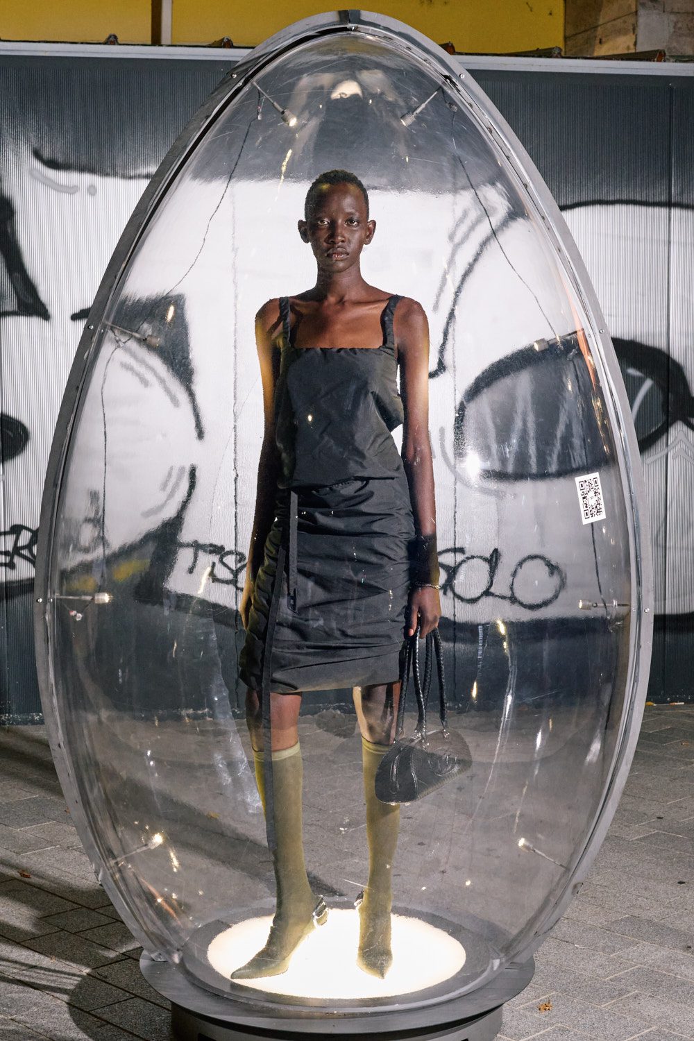 Lo stile sartoriale incontra il denim nella collezione Primavera/Estate 2026 di Diesel presentata con uno show alla Milano Fashion Week aperto al pubblico con i modelli rinchiusi all'interno di uova trasparenti