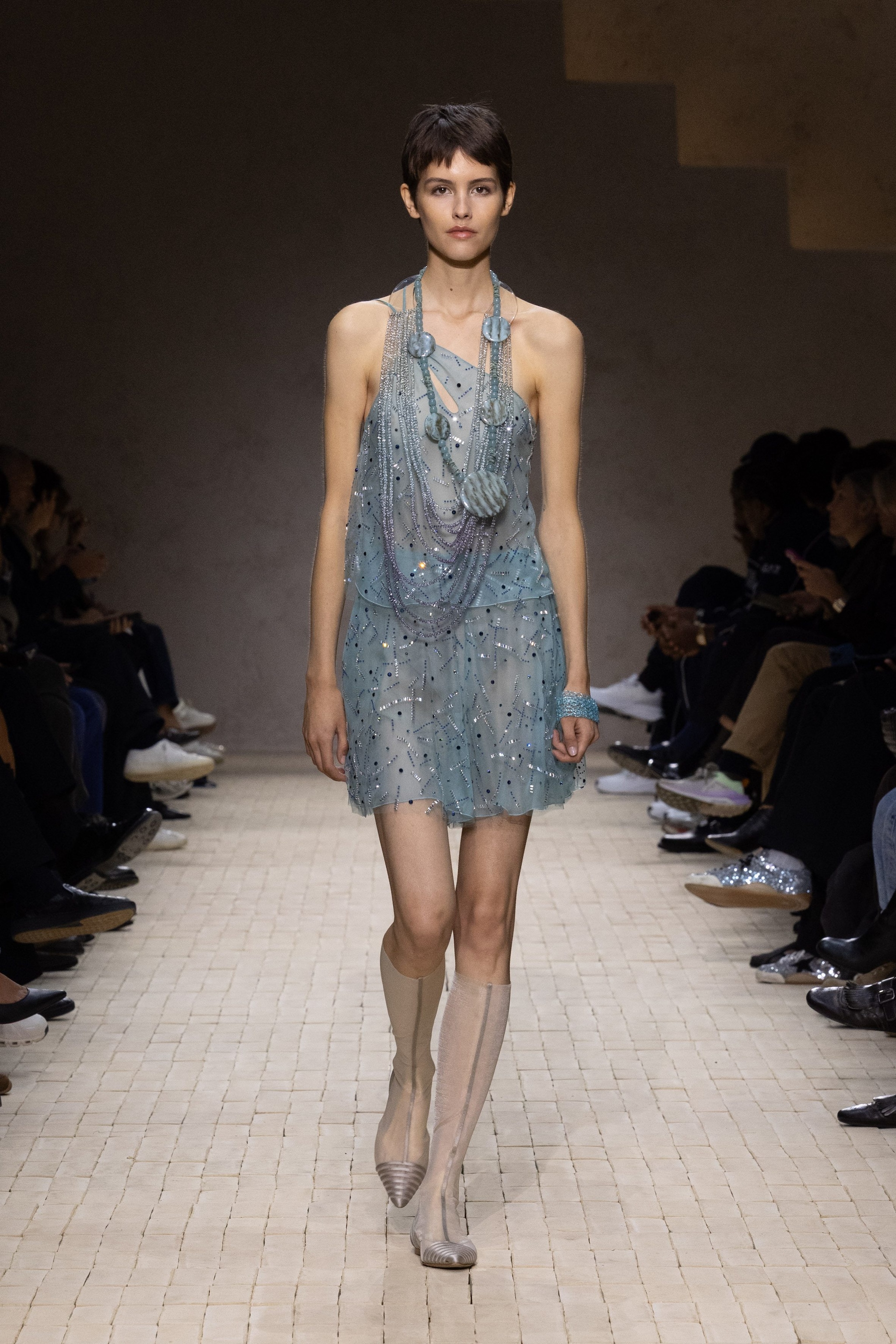 Va in scena alla Milano Fashion Week la prima sfilata di Emporio Armani dopo la morte dello stilista. Sulla passerella Primavera/Estate 2026 abiti morbidi nei toni del beige e del grigio, alternati a colori pastello e fantasie floreali, silhouette comode e tessuti leggeri come la seta.