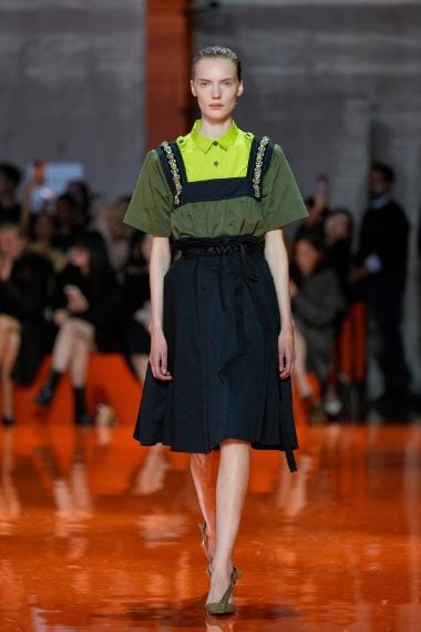 Rigorose tute dal'aria militare, alternate a gonne dai drappeggi volumetrici e alook in color block, accessori in satin e dettagli in pizzo sfilano alla Milano Fashion Week sulla passerella Primavera/Estate 2026 di Prada