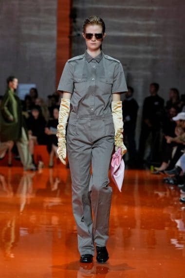 Rigorose tute dal'aria militare, alternate a gonne dai drappeggi volumetrici e alook in color block, accessori in satin e dettagli in pizzo sfilano alla Milano Fashion Week sulla passerella Primavera/Estate 2026 di Prada