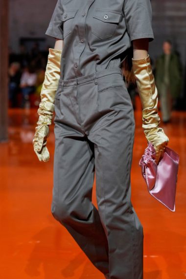 Rigorose tute dal'aria militare, alternate a gonne dai drappeggi volumetrici e alook in color block, accessori in satin e dettagli in pizzo sfilano alla Milano Fashion Week sulla passerella Primavera/Estate 2026 di Prada