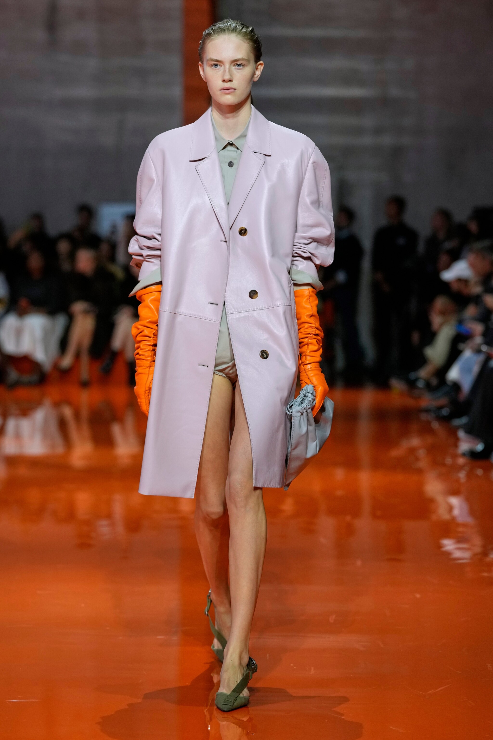 Rigorose tute dal'aria militare, alternate a gonne dai drappeggi volumetrici e alook in color block, accessori in satin e dettagli in pizzo sfilano alla Milano Fashion Week sulla passerella Primavera/Estate 2026 di Prada