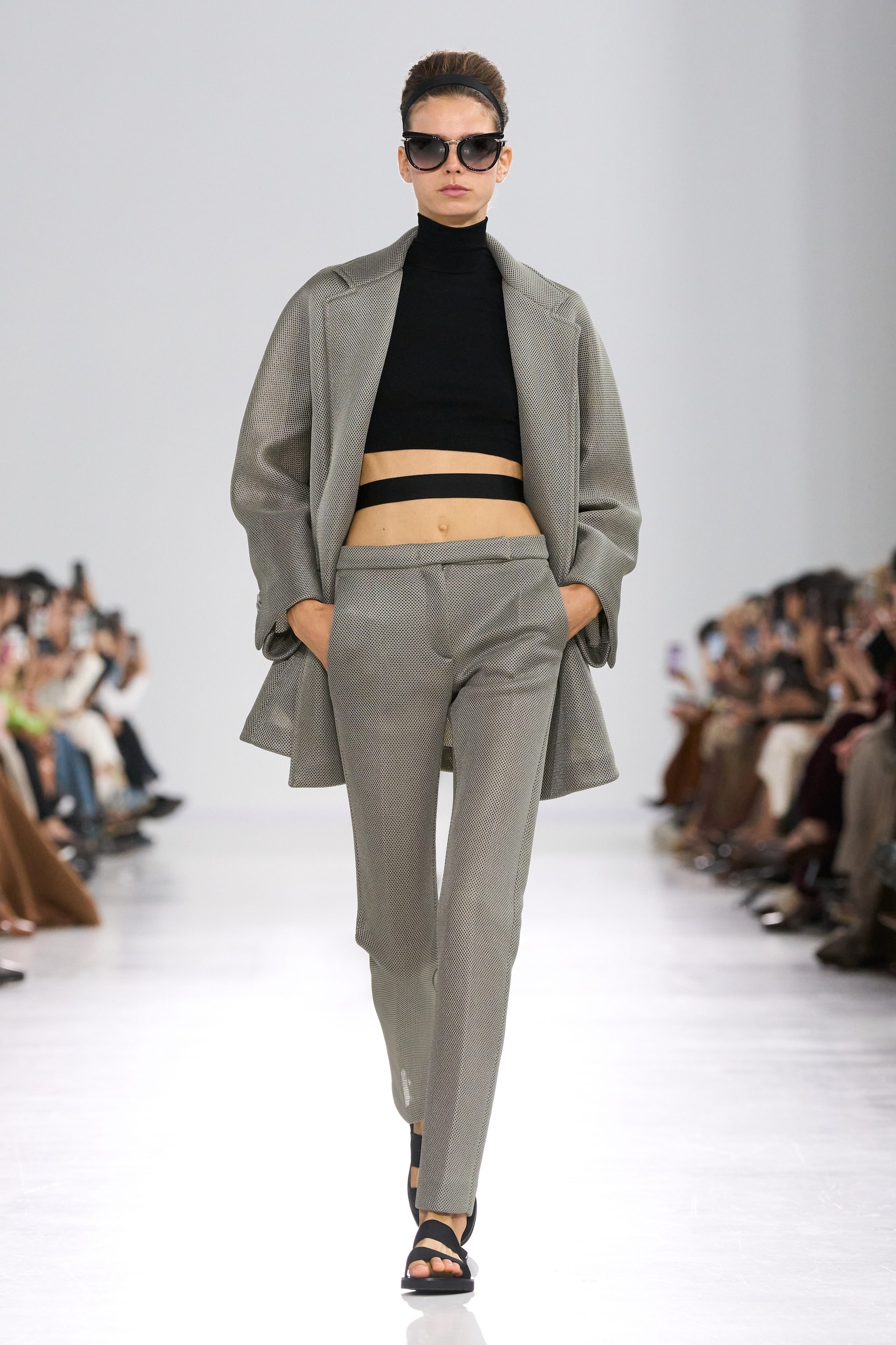Capi in beige e decorati con vaporose ruche, gilet sagomati e completi dai tagli spigolosi e dalla silhouette asciutta sfilano alla Milano Fashion Week sulla passerella Primavera/Estate 2026 di Max Mara
