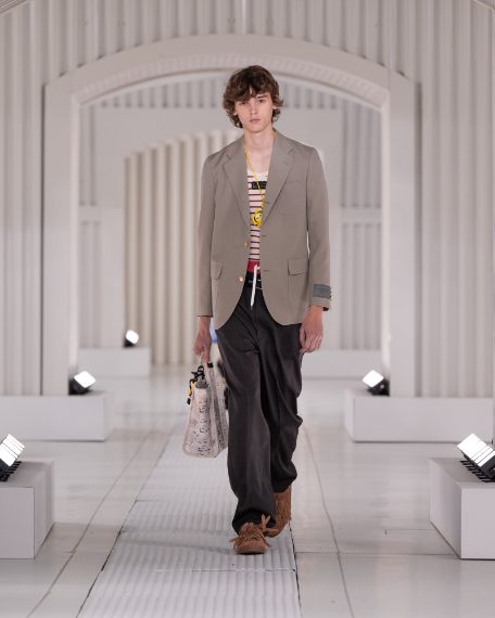 Blazer oversize e polo, lunghi gilet dai grossi bottoni e ancora maxi felpe, canotte a righe e abiti chemisier in seta sfilano alla Milano Fashion Week sulla passerella Primavera/Estate 2026 di Onitsuka Tiger