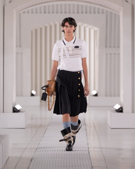 Blazer oversize e polo, lunghi gilet dai grossi bottoni e ancora maxi felpe, canotte a righe e abiti chemisier in seta sfilano alla Milano Fashion Week sulla passerella Primavera/Estate 2026 di Onitsuka Tiger