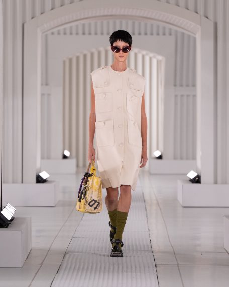 Blazer oversize e polo, lunghi gilet dai grossi bottoni e ancora maxi felpe, canotte a righe e abiti chemisier in seta sfilano alla Milano Fashion Week sulla passerella Primavera/Estate 2026 di Onitsuka Tiger