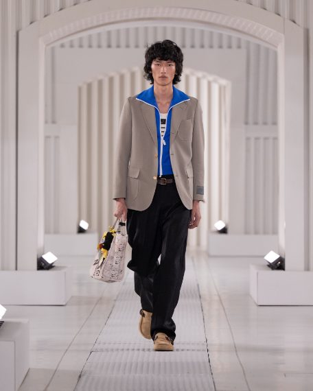 Blazer oversize e polo, lunghi gilet dai grossi bottoni e ancora maxi felpe, canotte a righe e abiti chemisier in seta sfilano alla Milano Fashion Week sulla passerella Primavera/Estate 2026 di Onitsuka Tiger