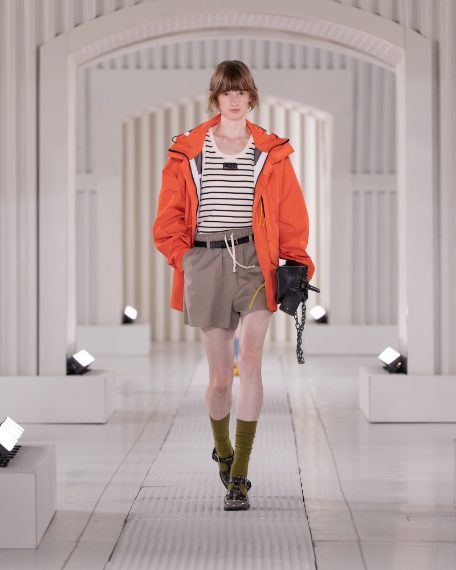 Blazer oversize e polo, lunghi gilet dai grossi bottoni e ancora maxi felpe, canotte a righe e abiti chemisier in seta sfilano alla Milano Fashion Week sulla passerella Primavera/Estate 2026 di Onitsuka Tiger