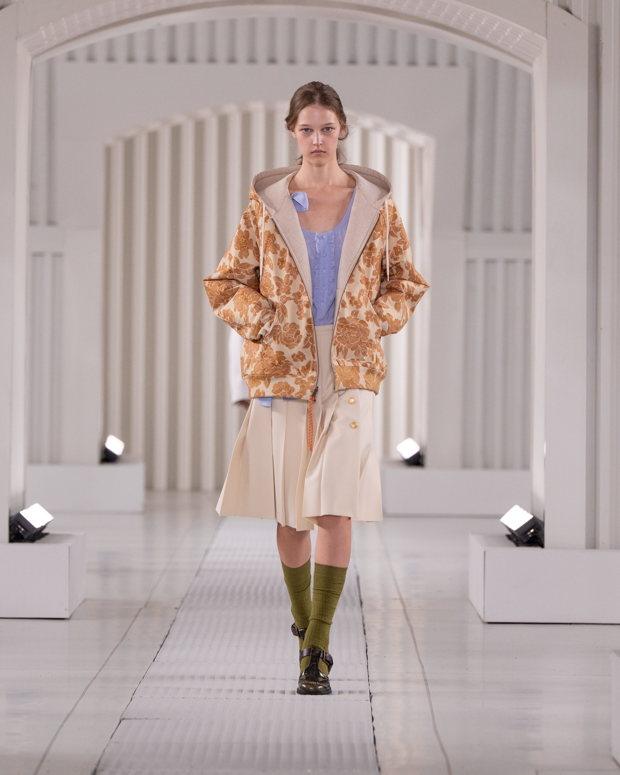 Blazer oversize e polo, lunghi gilet dai grossi bottoni e ancora maxi felpe, canotte a righe e abiti chemisier in seta sfilano alla Milano Fashion Week sulla passerella Primavera/Estate 2026 di Onitsuka Tiger