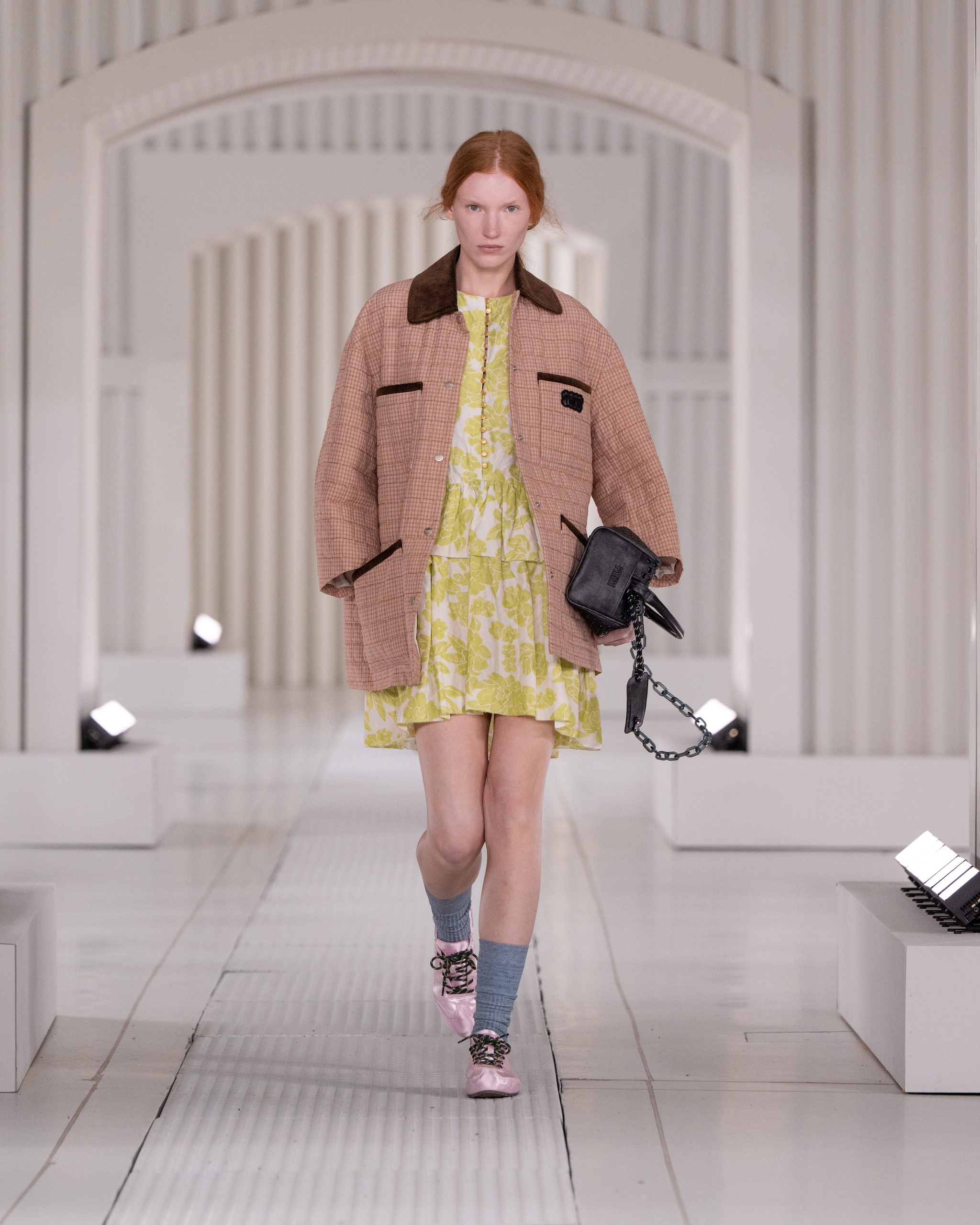Blazer oversize e polo, lunghi gilet dai grossi bottoni e ancora maxi felpe, canotte a righe e abiti chemisier in seta sfilano alla Milano Fashion Week sulla passerella Primavera/Estate 2026 di Onitsuka Tiger