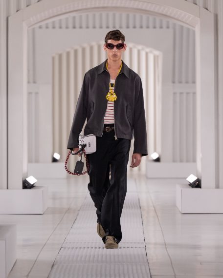 Blazer oversize e polo, lunghi gilet dai grossi bottoni e ancora maxi felpe, canotte a righe e abiti chemisier in seta sfilano alla Milano Fashion Week sulla passerella Primavera/Estate 2026 di Onitsuka Tiger
