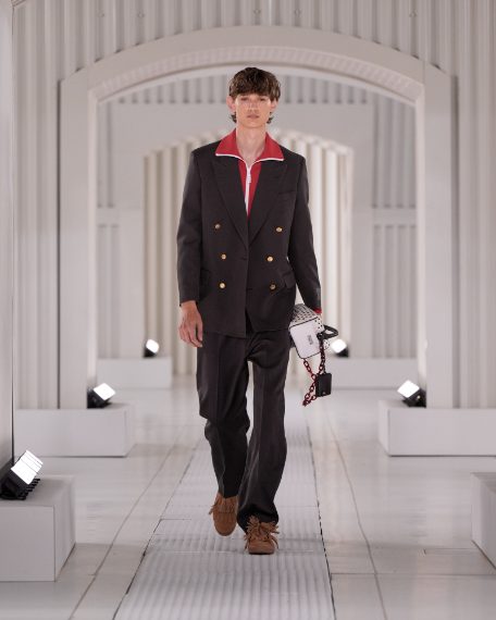 Blazer oversize e polo, lunghi gilet dai grossi bottoni e ancora maxi felpe, canotte a righe e abiti chemisier in seta sfilano alla Milano Fashion Week sulla passerella Primavera/Estate 2026 di Onitsuka Tiger