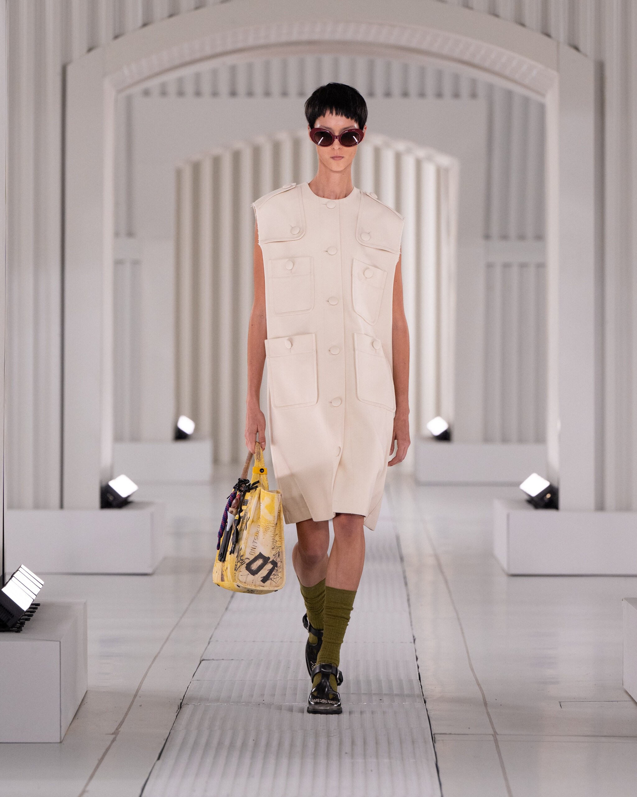 Blazer oversize e polo, lunghi gilet dai grossi bottoni e ancora maxi felpe, canotte a righe e abiti chemisier in seta sfilano alla Milano Fashion Week sulla passerella Primavera/Estate 2026 di Onitsuka Tiger