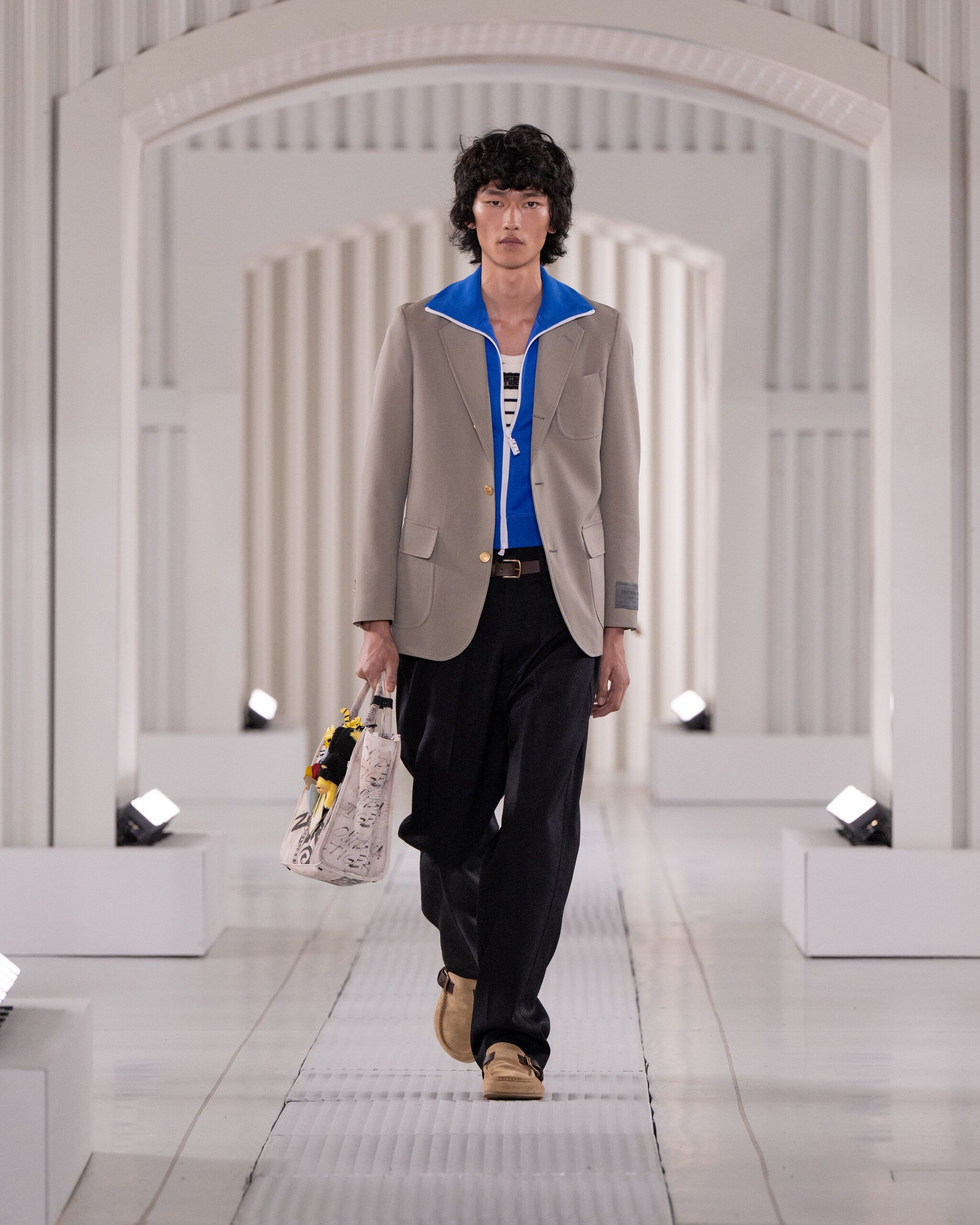 Blazer oversize e polo, lunghi gilet dai grossi bottoni e ancora maxi felpe, canotte a righe e abiti chemisier in seta sfilano alla Milano Fashion Week sulla passerella Primavera/Estate 2026 di Onitsuka Tiger