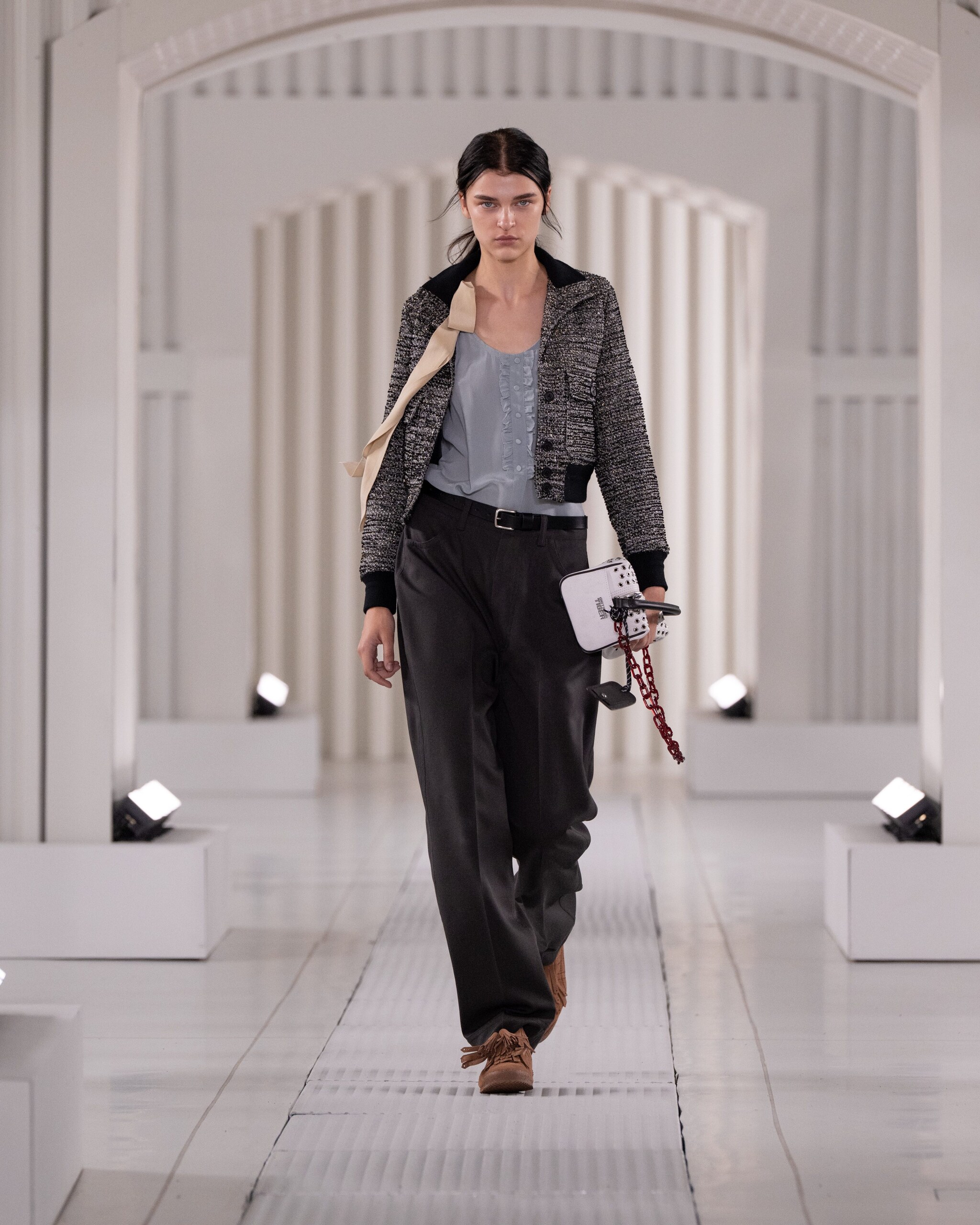 Blazer oversize e polo, lunghi gilet dai grossi bottoni e ancora maxi felpe, canotte a righe e abiti chemisier in seta sfilano alla Milano Fashion Week sulla passerella Primavera/Estate 2026 di Onitsuka Tiger