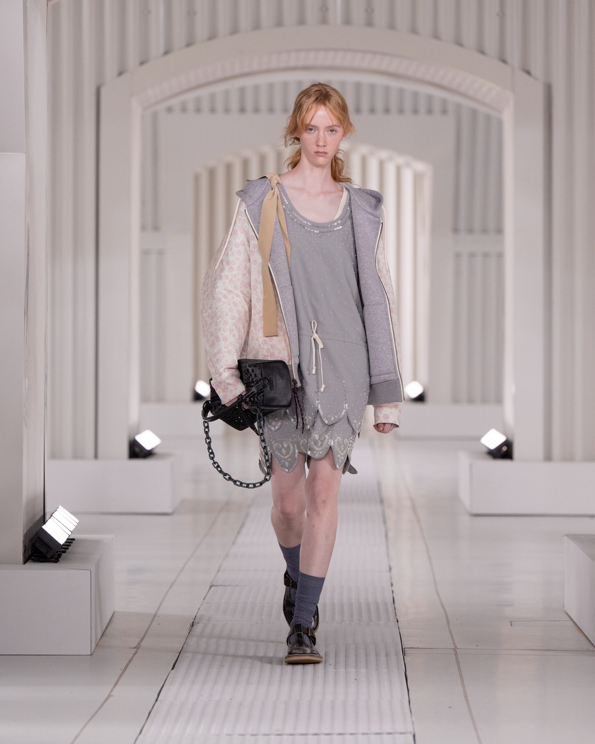 Blazer oversize e polo, lunghi gilet dai grossi bottoni e ancora maxi felpe, canotte a righe e abiti chemisier in seta sfilano alla Milano Fashion Week sulla passerella Primavera/Estate 2026 di Onitsuka Tiger