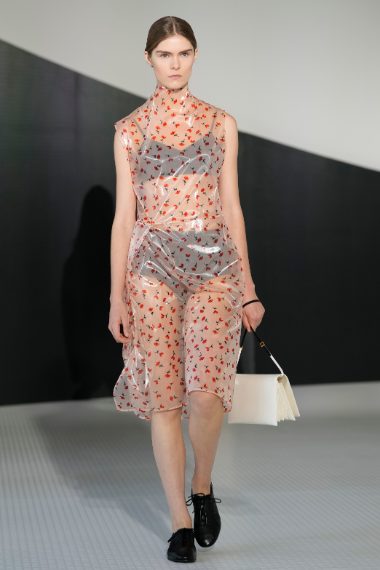 Abiti velati o dagli orli "spigolosi", maglioncini crop e abiti con oblò che mostrano reggiseni coperti di macro paillettes sfilano alla Milano Fashion Week sulla passerella Primavera/Estate 2026 di Jil Sander nella prima collezione firmata da Simone Bellotti