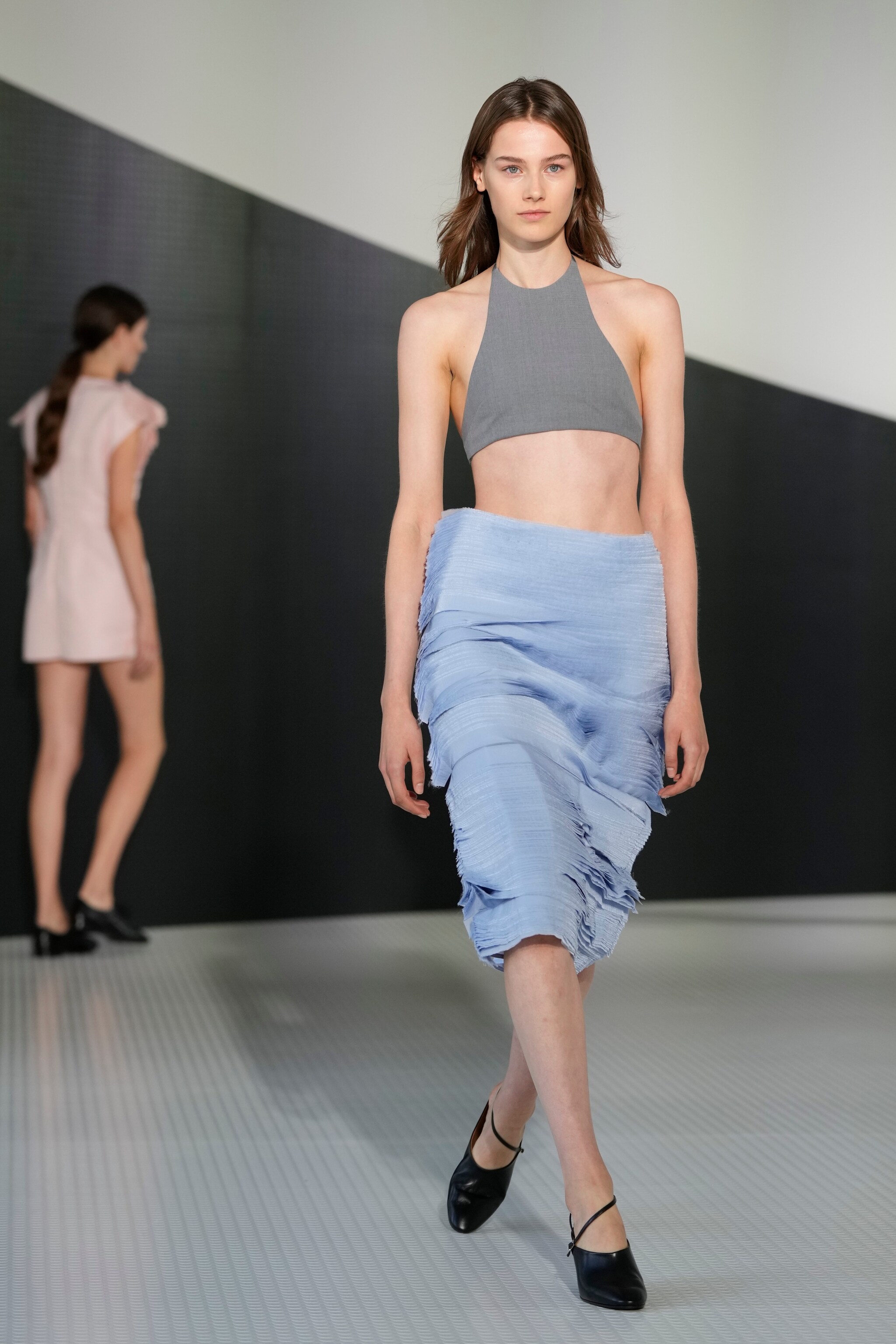 Abiti velati o dagli orli "spigolosi", maglioncini crop e abiti con oblò che mostrano reggiseni coperti di macro paillettes sfilano alla Milano Fashion Week sulla passerella Primavera/Estate 2026 di Jil Sander nella prima collezione firmata da Simone Bellotti