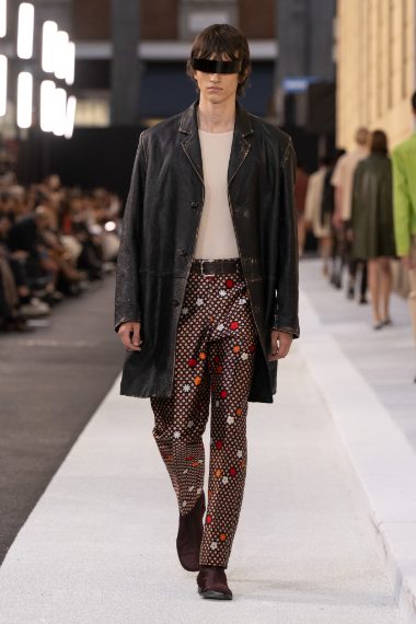 Giacche in pelle, trench e abiti tagliati sulle spalle o con micro fantasie floreali sfilano alla Milano Fashion Week sulla passerella Primavera/Estate 2026 di MM6 Maison Margiela