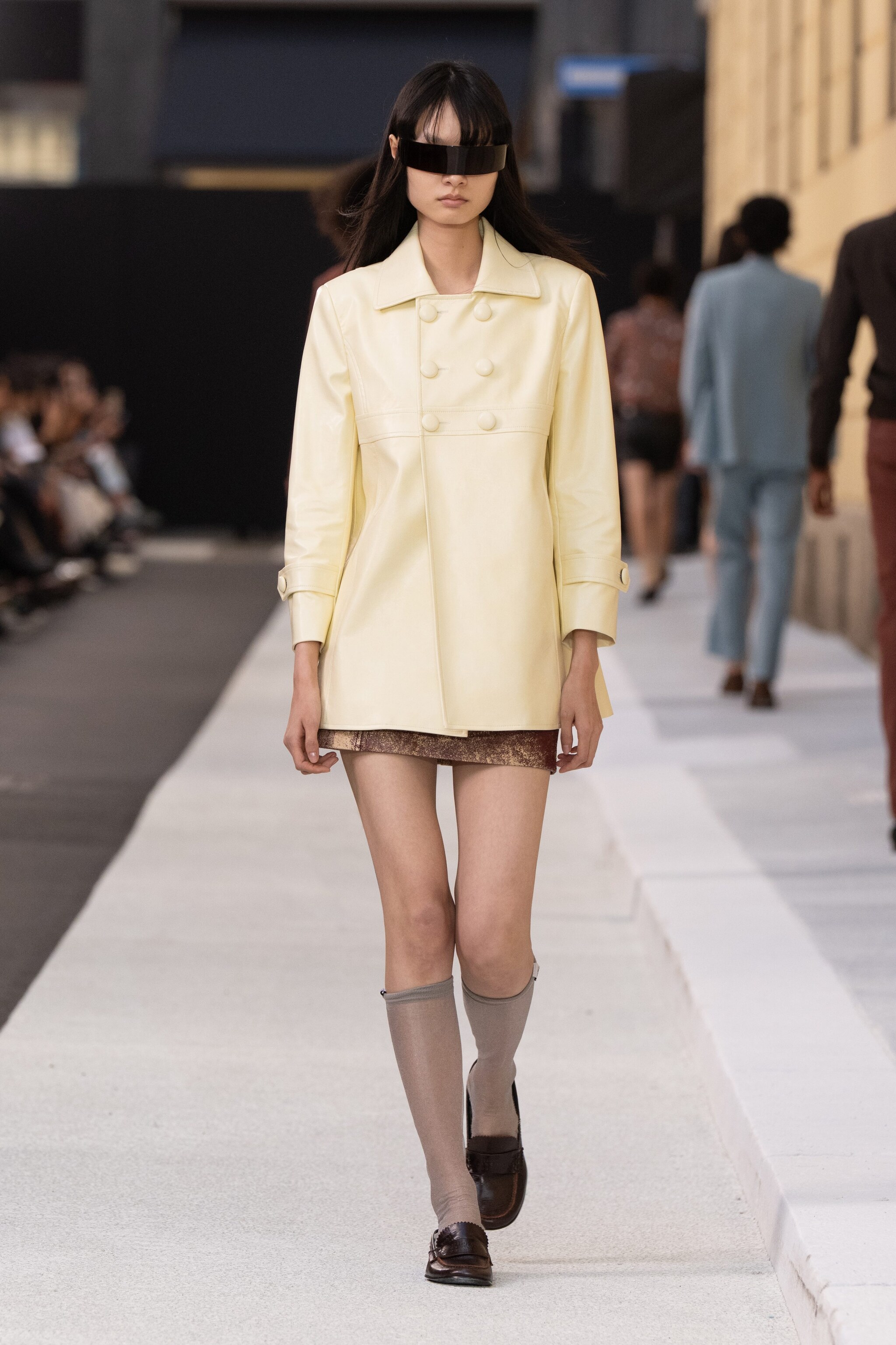 Giacche in pelle, trench e abiti tagliati sulle spalle o con micro fantasie floreali sfilano alla Milano Fashion Week sulla passerella Primavera/Estate 2026 di MM6 Maison Margiela