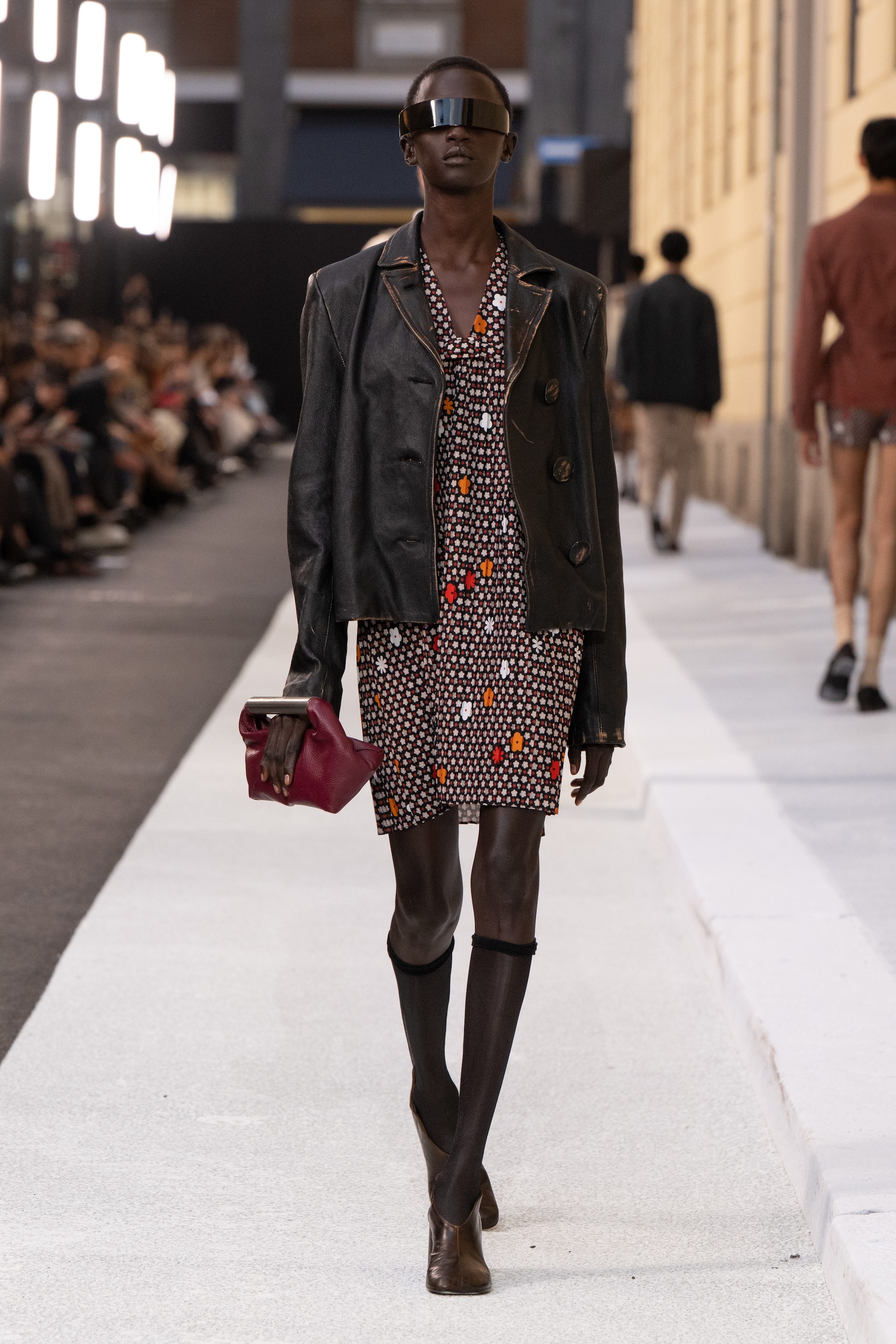 Giacche in pelle, trench e abiti tagliati sulle spalle o con micro fantasie floreali sfilano alla Milano Fashion Week sulla passerella Primavera/Estate 2026 di MM6 Maison Margiela