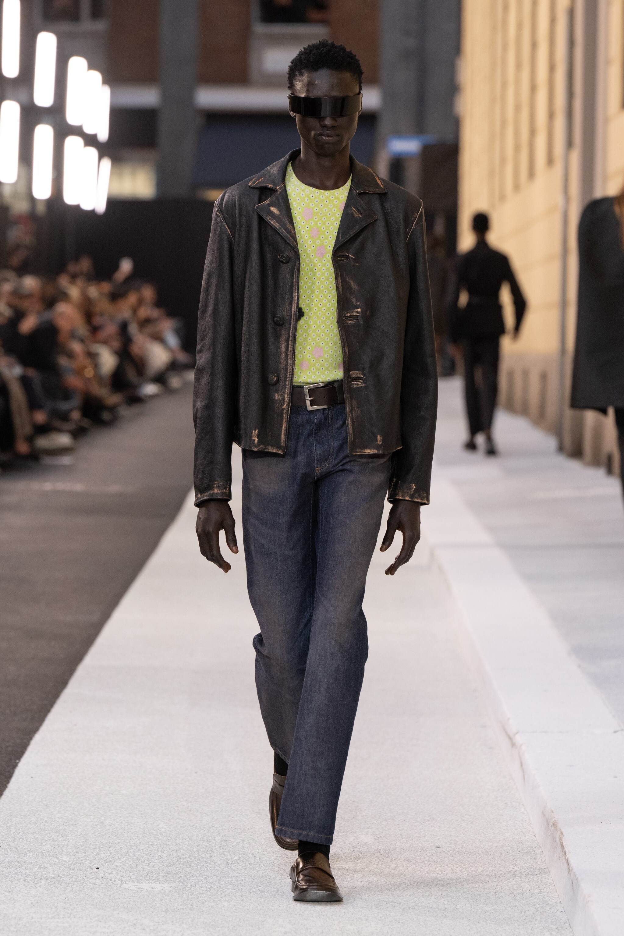 Giacche in pelle, trench e abiti tagliati sulle spalle o con micro fantasie floreali sfilano alla Milano Fashion Week sulla passerella Primavera/Estate 2026 di MM6 Maison Margiela